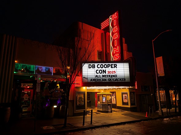 the kiggins theater in vancouver washington at night with a marquee reading db cooper con 2025